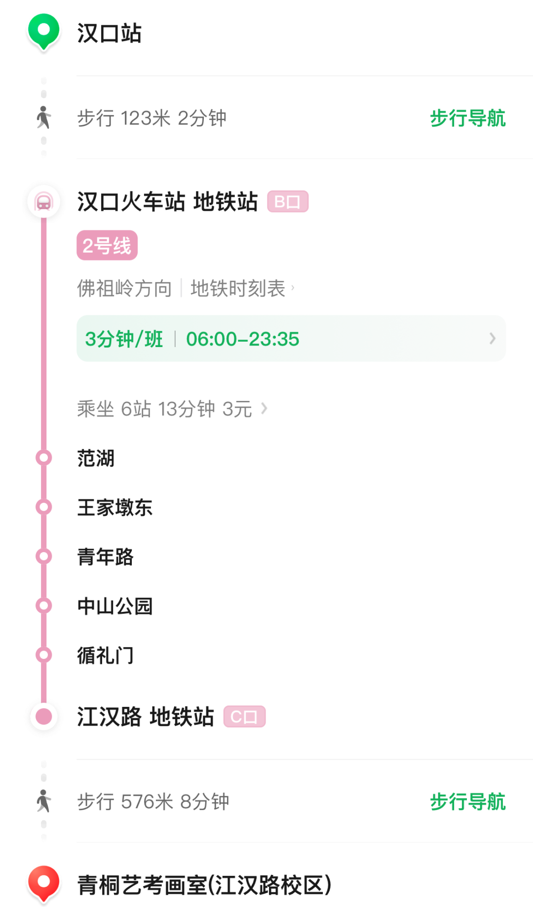 ②路线二:高铁到【汉口火车站】地铁站 乘 轨道交通2号线(佛祖岭方向)到达江汉路地铁站c出口, 步行8分钟到达青桐画室。